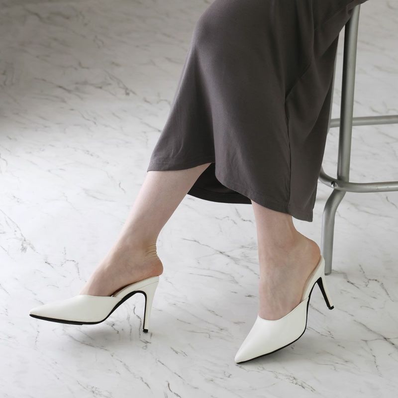 大人エッジィな美しいラインのポインテッドトゥのピンヒールミュールは、洗練されたシャープでレディな佇まいを醸す1足。