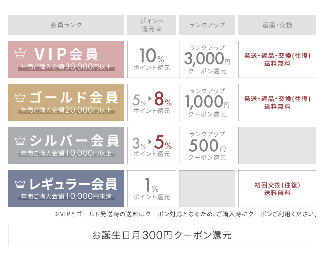 ※会員ランクは購入金額の条件をクリアするとその度ごとにステージアップします。