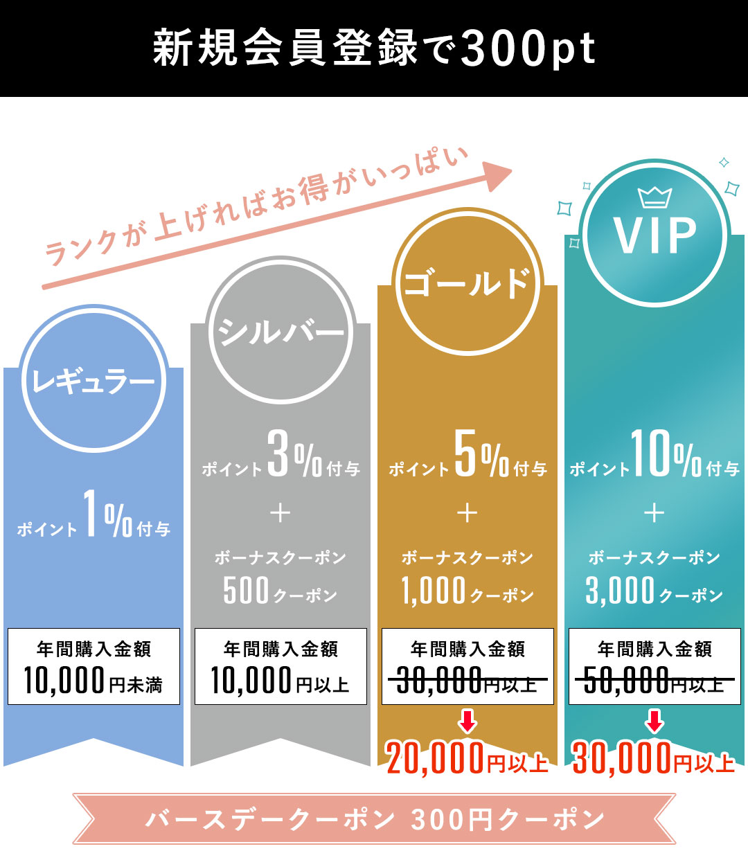 また「初回購入日より12ヵ月」でランクは一度再判定されますので、1年間の購入金額によってステージダウンする場合もございます。 - バースデークーポンの有効期限は1ヶ月です。