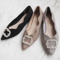 ポインテッドトゥパールバックルフラワーカットパンプス