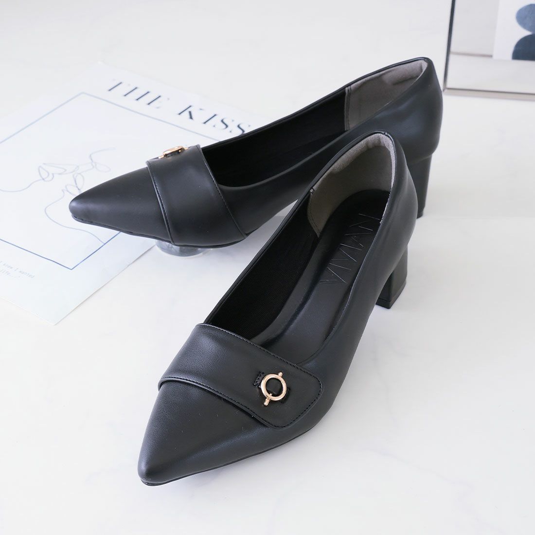 VIVIAN ポインテッドトゥVカットバックルベルトミュールパンプス